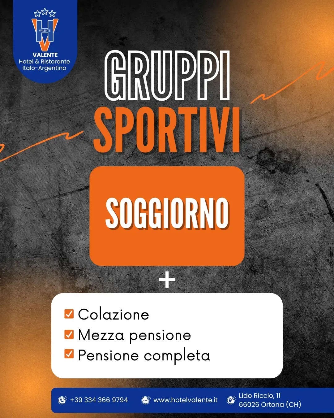 - Per ritiri sportivi, tornei e competizioni a Ortona, proponiamo tariffe dedicate per gruppi sportivi, sconti su pensione completa e pacchetti su misura in base a numero partecipanti e date.